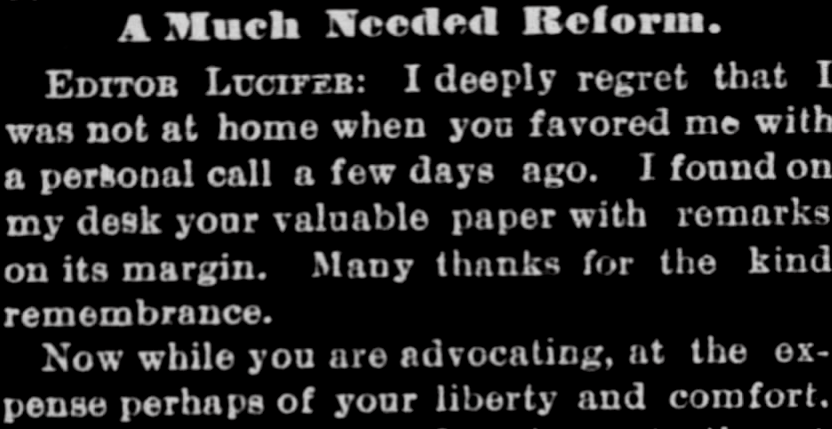 Lucifer’s Place in Journalism – Moses Harman, 10/16/1902 Republished from our predecessor publication Lucifer the Light Bearer A brief dispute between M.D. and the Founder […]